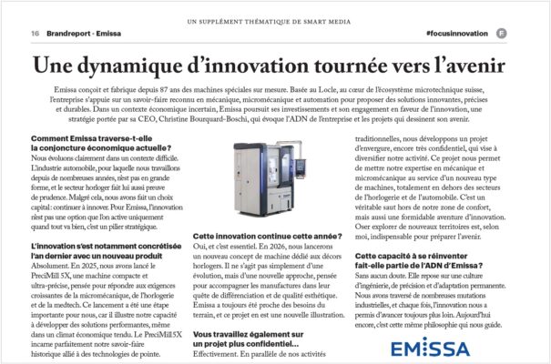 EMISSA SA est née de la volonté de proposer des solutions d’usinage haute performance alliant innovation et fiabilité. Depuis sa création, l’entreprise accompagne les industriels à chaque étape de leurs projets, du développement sur mesure aux produits standardisés.